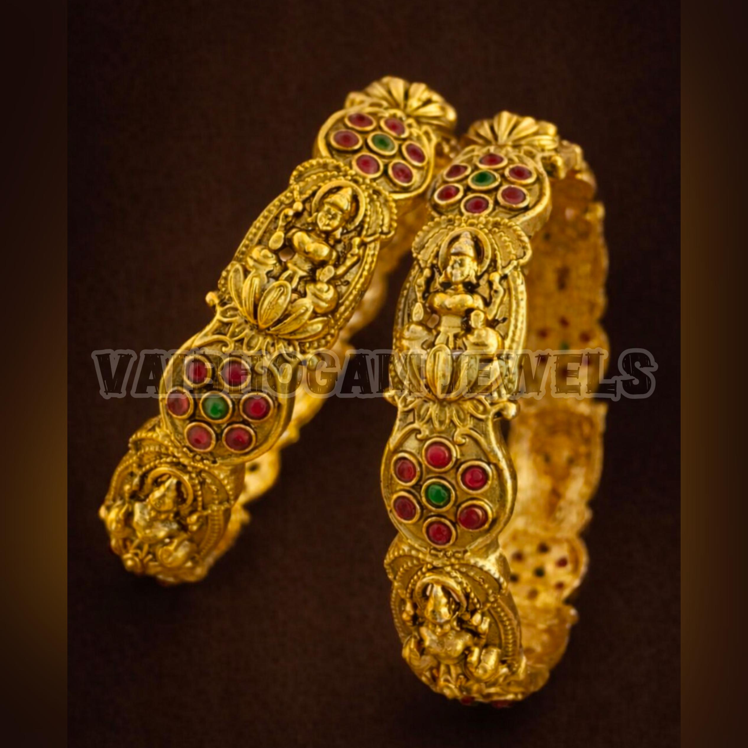 Add a touch of tradition to your wrists with these stunning antique gold-plated bangles, inspired by classic South Indian temple jewelry. Crafted with intricate detailing and embellished with ruby, emerald, or pearl accents, these bangles beautifully complement sarees, lehengas, and other ethnic wear.